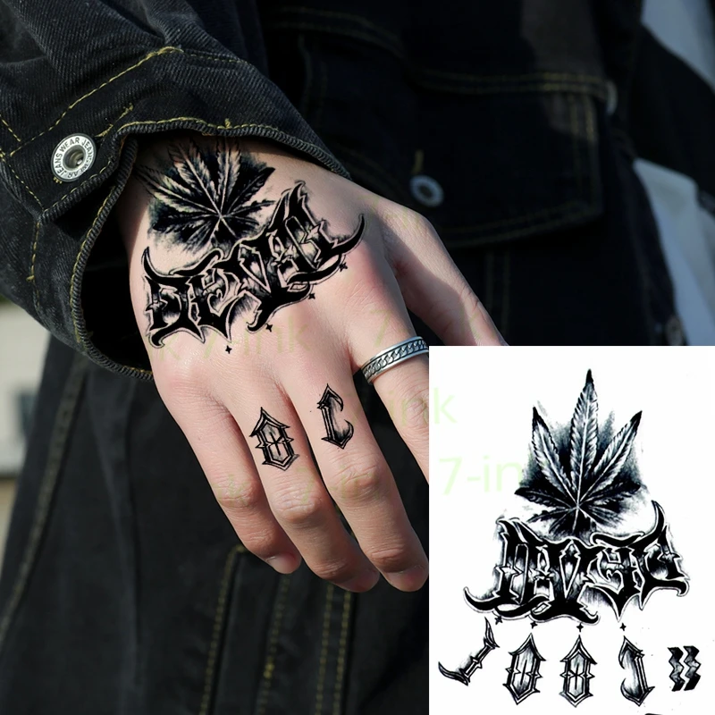 קנו קעקועים ואמנות גוף Waterproof Temporary Tattoo Sticker Retro Black Maple Leaf Roman Numerals On Back Of Hand Flash Tatoo Fake Tattoos For Women Men